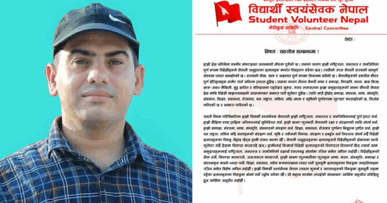 यस्तो विषम परिस्थितिमा हाम्रो विद्यार्थी स्वयंसेवक नेपाल चुप लागेर बस्न सक्दैन् । हाम्रो राष्ट्रियता, जनतन्त्र र जनजिविकालाई पुर्ण रुपमा प्राप्त गर्न जस्तोसुकै संघर्ष गर्न तयार रहेको छ । हाम्रो शैक्षिक एवम् प्राज्ञिक अधिकार समाप्त पार्न खाेज्ने दलालहरुका विरुद्ध संघर्ष गर्न तयार रहेकाे छ । हाम्रो साझा फुलबारी नेपालकाे रक्षा र संरक्षणकाे लागि संघर्ष गर्न तयार भएका छाैं । हाम्रो सम्पदा, संरचना, भाषा, संस्कृति, संस्कार, शिक्षा, स्वास्थ्य, राेजगार, वन जङ्गल, जमिन नदि नाला र कृषिकाे लुटपाट र समाप्त पार्ने जस्ताेसुकै विदेशी दलालहरुका विरुद्ध जेहाद छेड्न हामी तयार छाैं । मुख्यतः राष्ट्रियता भनेको सत्ता, अदालत र सेना हाे । जनतन्त्र भनेको जनताले चलाउने सत्ता, अदालत र सेना हाे । र जनजिविका भनेको शिक्षा, स्वास्थ्य, आवास, राेजगार, सुचना, खेलकुद र मनाेरन्जन हाे । यी तिनै कुराकाे पहिचान नै हाम्रो भाषा, संस्कृति, सम्पदा, संस्कार, बलिदान, त्याग, समर्पण र सम्मान हाे । यसलाई दलालहरुले समाप्त पारि विदेशीहरुकाे ईसारामा चल्ने कुचेष्टा गर्दै देशमा विचण्डा मच्चाउदै छन् । हामीलाई किमार्थ विदेशी दलालहरुकाे विचण्डता स्विकार्य छैन् तसर्थ आम समुदायहरुमा राष्ट्रियता, जनतन्त्र र जनजिविकाे रक्षार्थ एकताबद्ध संघर्षमा उत्रिन अपिल गर्दै विदेशीहरुकाे सेवा गर्ने, विचण्डा मच्चाउने, अराजकता मच्चाउने, हाम्राे साझा फुलबारीका फुलहरु भाषा, कला, संस्कृति, सम्पदा र संरचनाहरु मास्ने-ध्वस्त पार्ने, शिक्षा, स्वास्थ्य, उद्योग कलकारखाना ध्वस्त पार्ने जुनसुकै दलालहरुकाे विरुद्धमा जनप्रतिवादमा उत्रिन समेत बिशेष अपिल गर्दछौं । हाम्रो विद्यार्थी स्वयंसेवक नेपाल त्यस्ता कुकर्म र अपराधहरुकाे विरुद्धमा जुनसुकै तहमा रहेका दलालहरुका विरुद्धमा संघर्ष गर्ने उद्घाेष समेत गर्दछौं ।